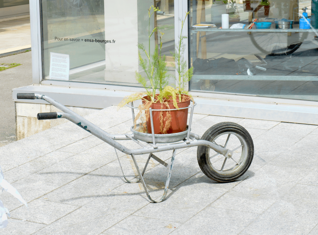 Une brouette qui permet de se promener dans la ville avec des plants en pot, ici du fenouil.