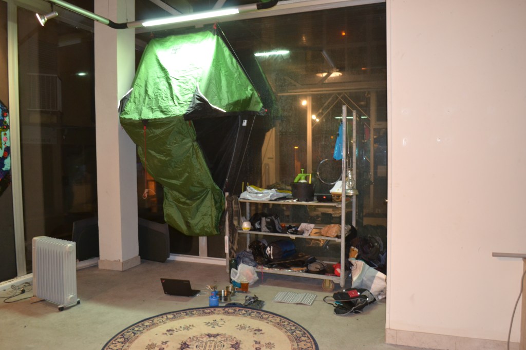 Photos documentaires du bivouac pour veiller les plants durant les sessions de deux nuits et trois jours