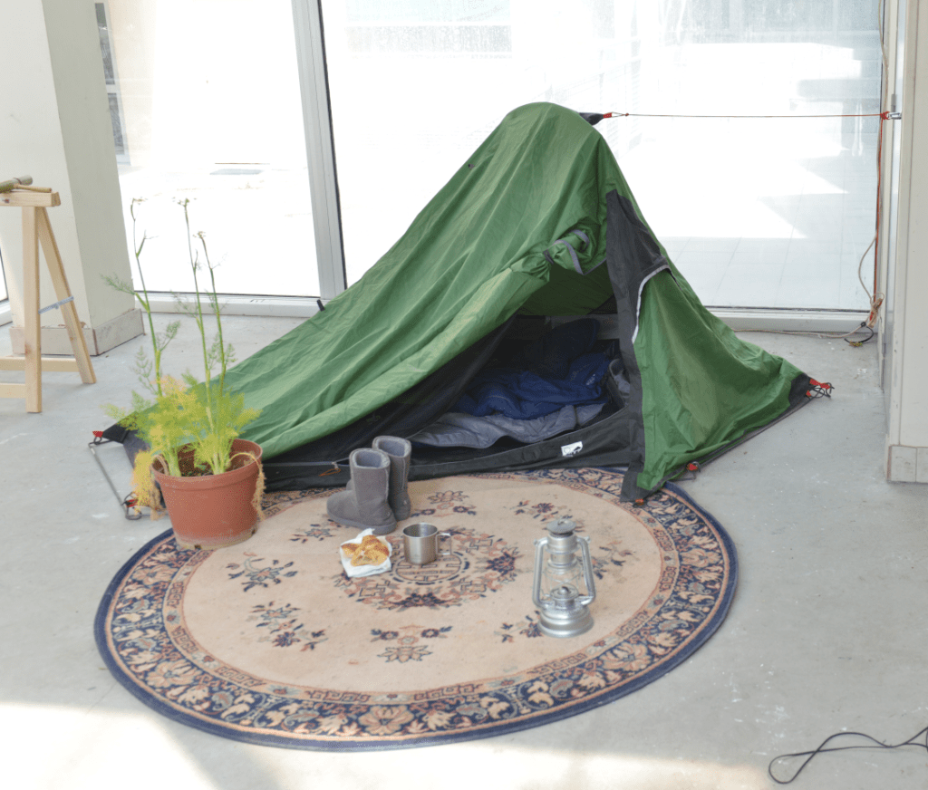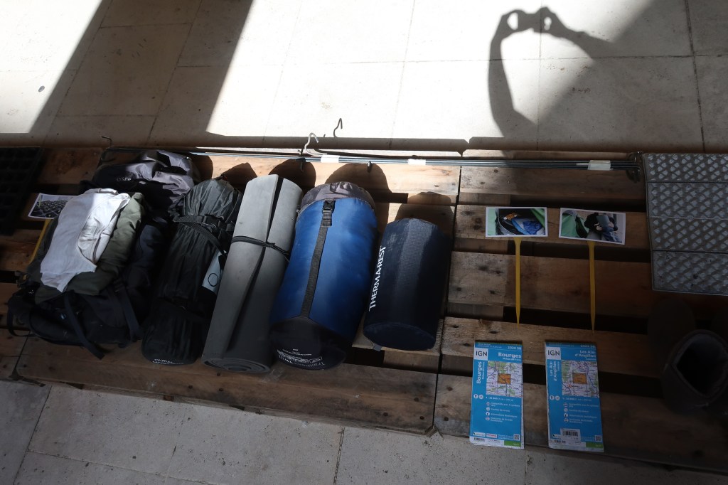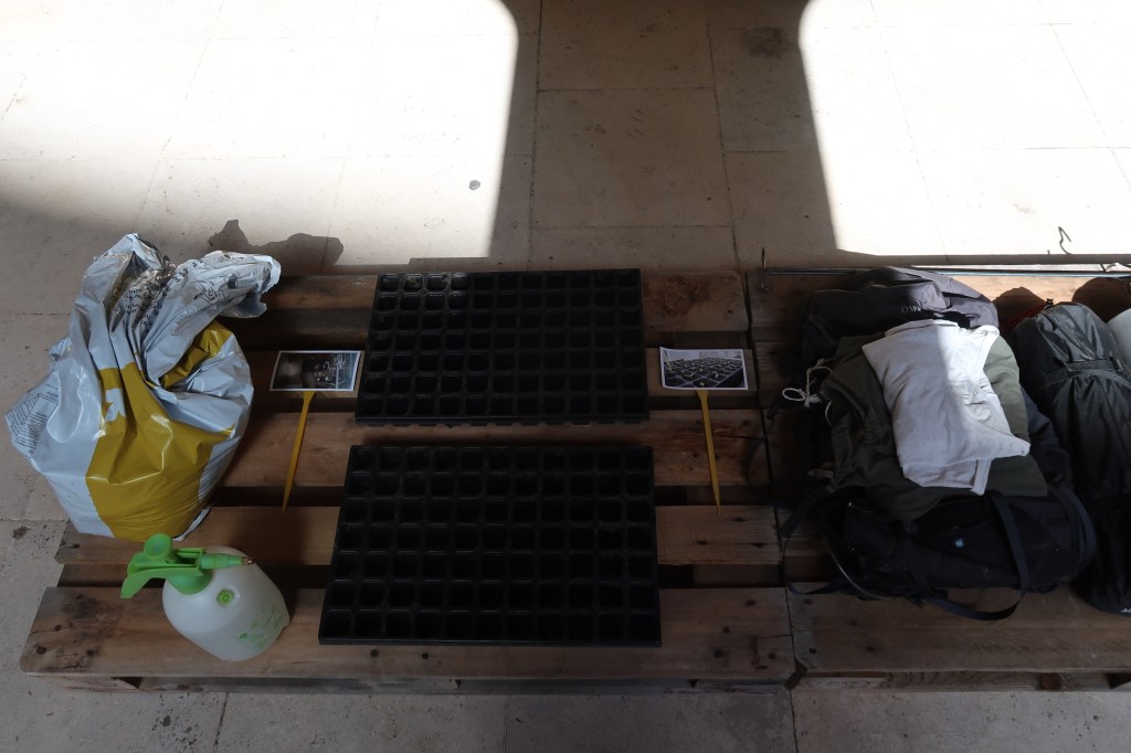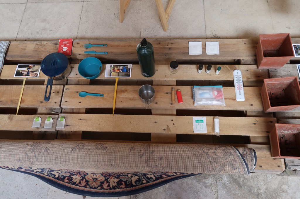 Toile de tente, outillage de camping, tapis, thermomètre, graines de laitue, radis et fenouil, sachets de graines, tableau en liège, vaporisateur, lampe à pétrole, tapis, palettes en bois, brouette, chariot de