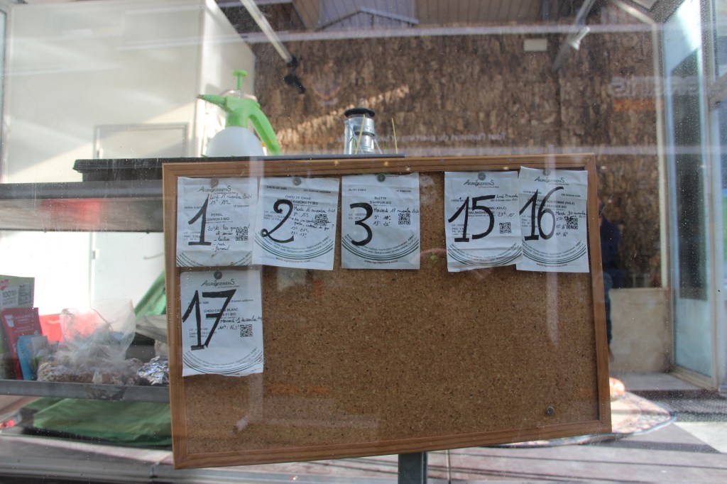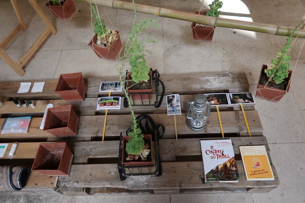 Tréteaux, planche bois, salades et fenouils en pots plastiques, métal, aggloméré imputrescible, sangles, châssis, carnet