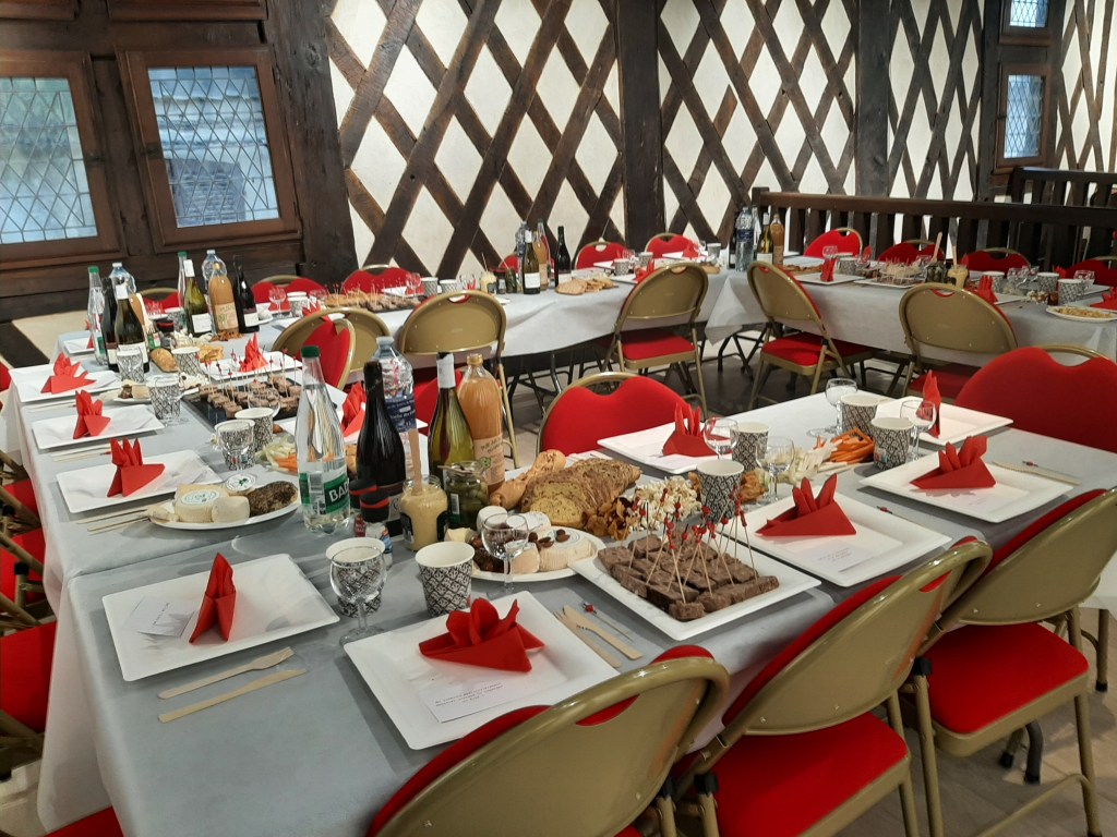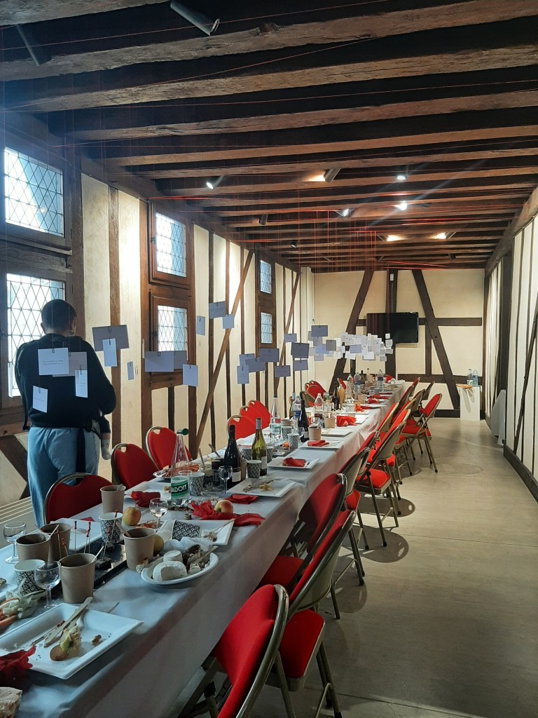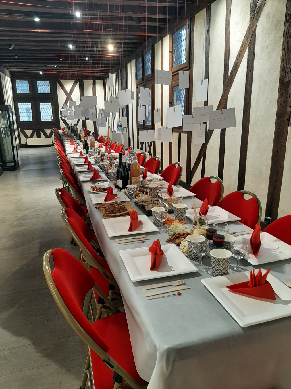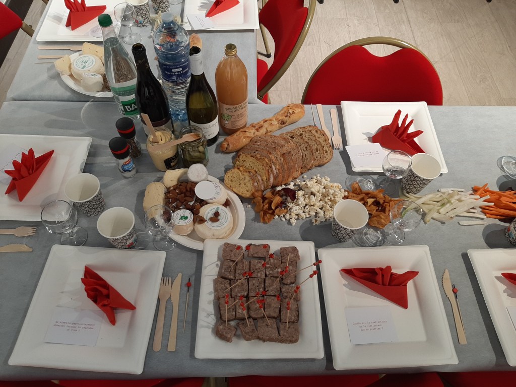 fil à coudre rouge, fil de maçonnerie rouge, papier format A7 blanc, trombones noirs, serviettes en papier rouge, nappe en papier blanc, aliments divers (charcuteries, fromages, légumes d’hivers, pommes, sablés, etc), assiettes et couverts en cartons, bouteilles, verres, et autres ustensiles qui servent au temps du repas.