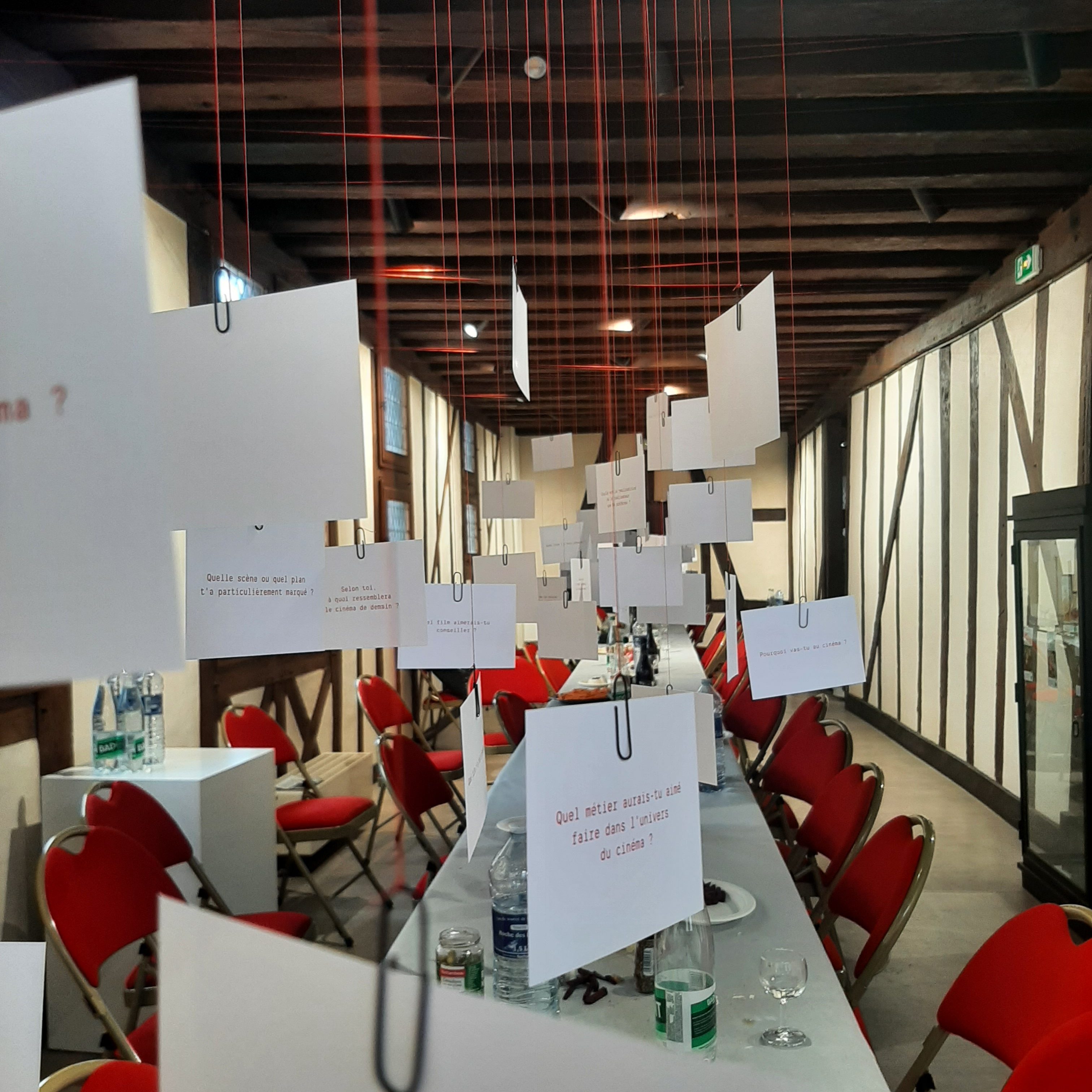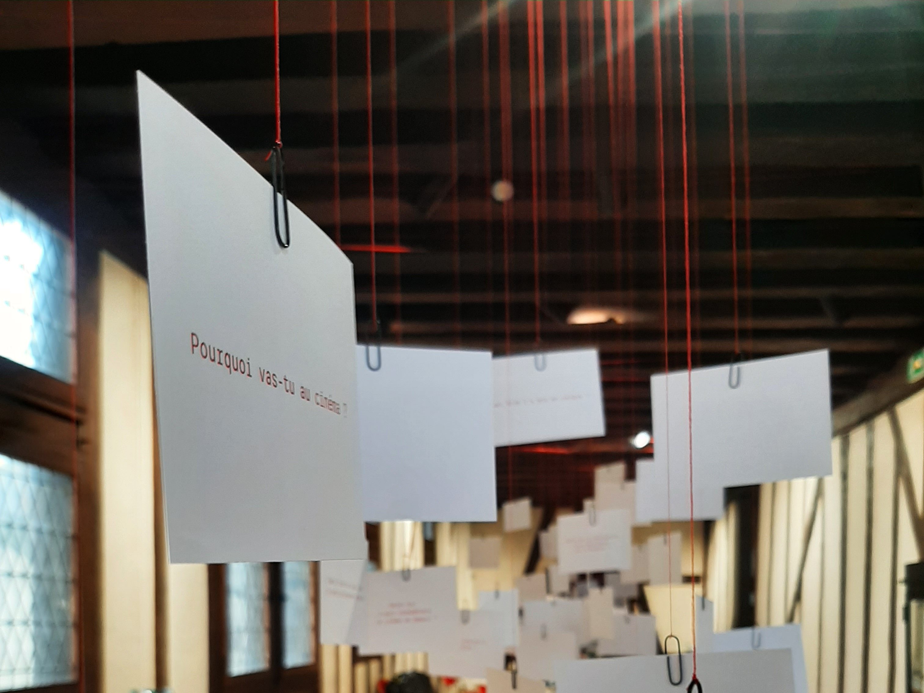 Tendre le bras pour se saisir d’un carton suspendu, sur lequel est inscrit une question qui propose de se souvenir et d’échanger autour d’un sujet qui nous relie intimement au cinéma.
